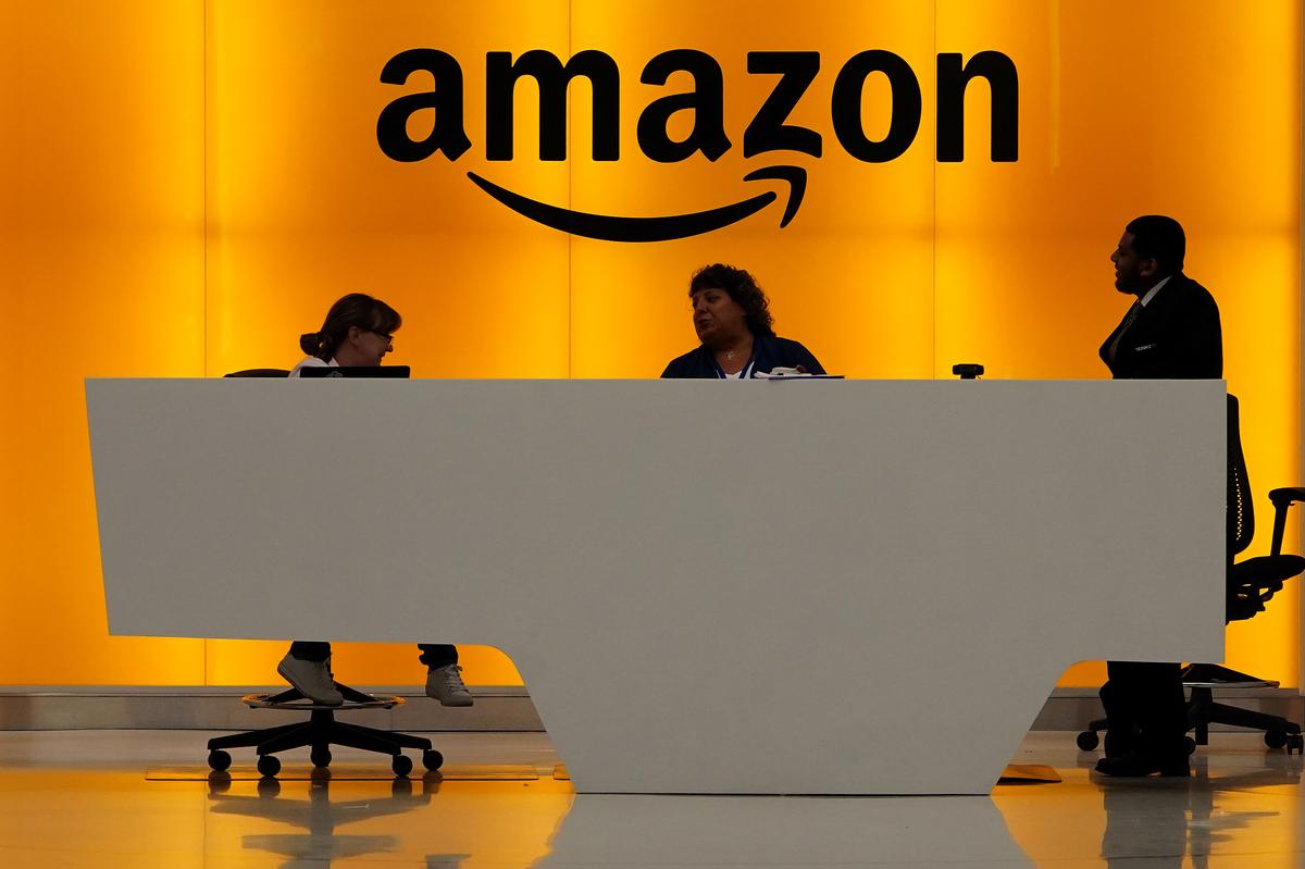 FILE PHOTO: Staff chat at the front desk of the Amazon office in the Manhattan borough of New York, New York, U.S., May 1, 2019. REUTERS/Carlo Allegri