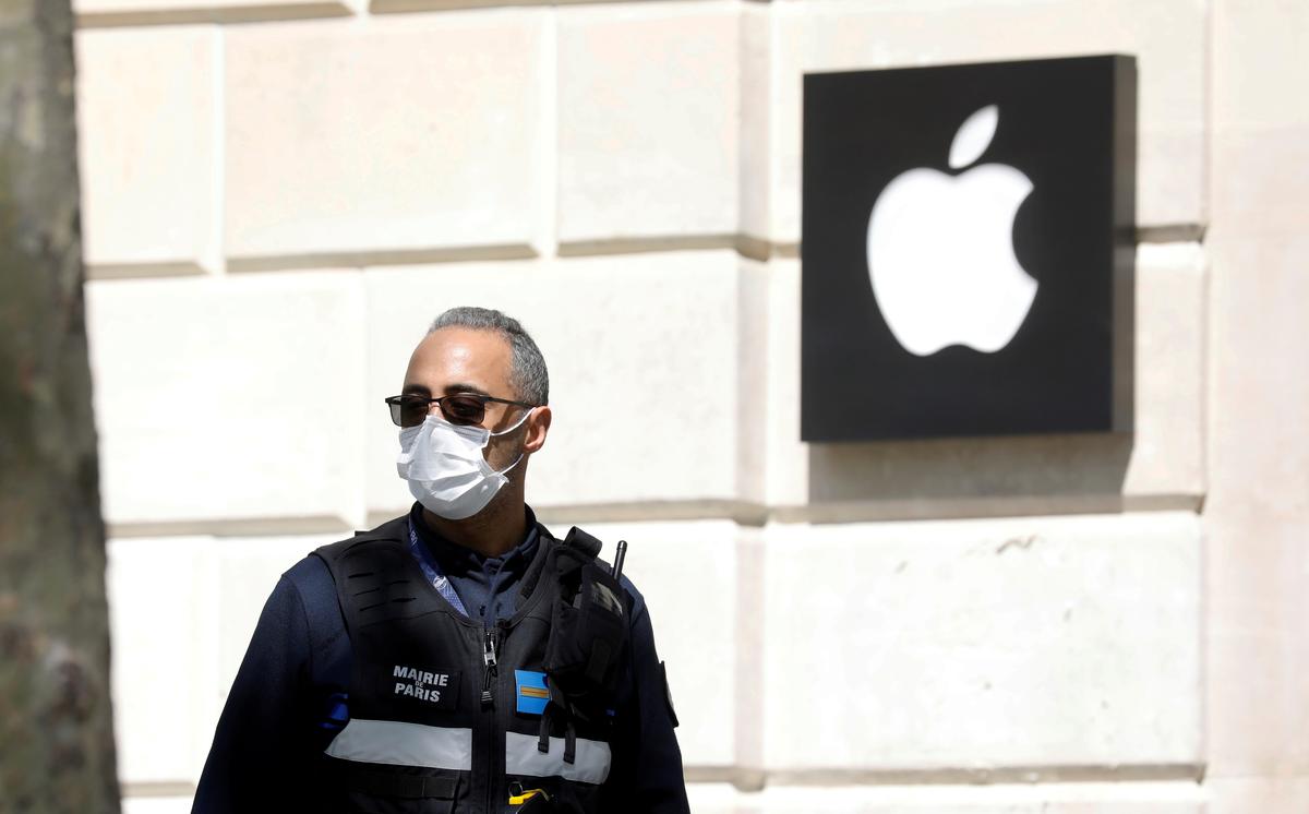 FILE PHOTO: A municipal policeman wearing a protective face mask walks past the closed Apple store on the Champs-Elysees avenue in Paris as a lockdown is imposed to slow the rate of the coronavirus disease (COVID-19) in France, April 16, 2020. REUTERS/Charles Platiau/File Photo