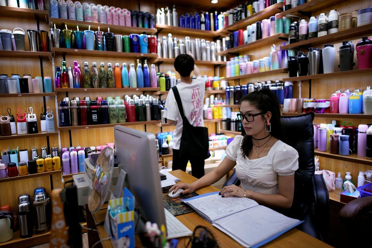 Deng Jinling, manager of Lucky Bird Trade Co. checks her online store on a company at a cup products shop at the Yiwu Wholesale Market following an outbreak of the novel coronavirus disease (COVID-19), in Yiwu, Zhejiang province, China June 2, 2020. Picture taken June 2, 2020. REUTERS/Aly Song
