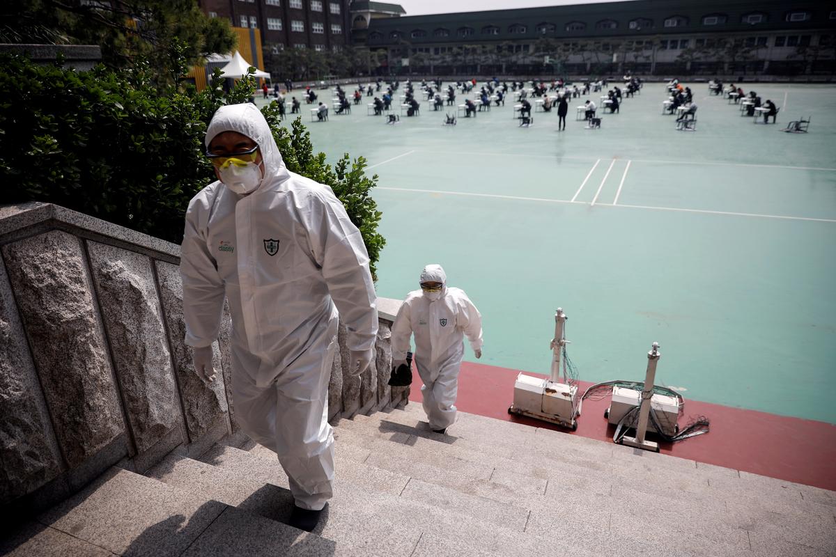 FILE PHOTO: People in personal protective equipment walk up a flight of stairs as South Korean job seekers (background) attend an exam conducted outdoors amid social distancing measures to avoid the spread of the coronavirus disease (COVID-19), in Seoul, South Korea, April 25, 2020. REUTERS/Kim Hong-Ji/File Photo