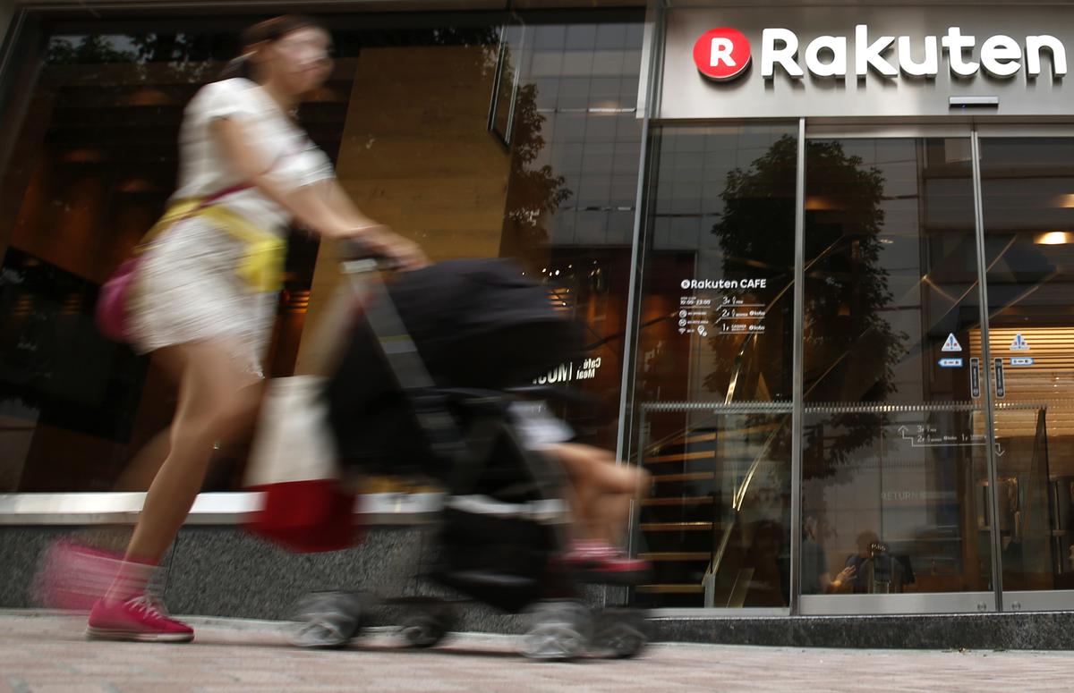 FILE PHOTO: A woman pushing a pram walks in front of a Rakuten Cafe store at a shopping district in Tokyo August 4, 2014. Japan’s largest e-commerce company Rakuten Inc posted a 9.9 percent decrease in second quarter operating profit, dragged lower by weaker trading volumes on its Internet finance platform. REUTERS/Yuya Shino