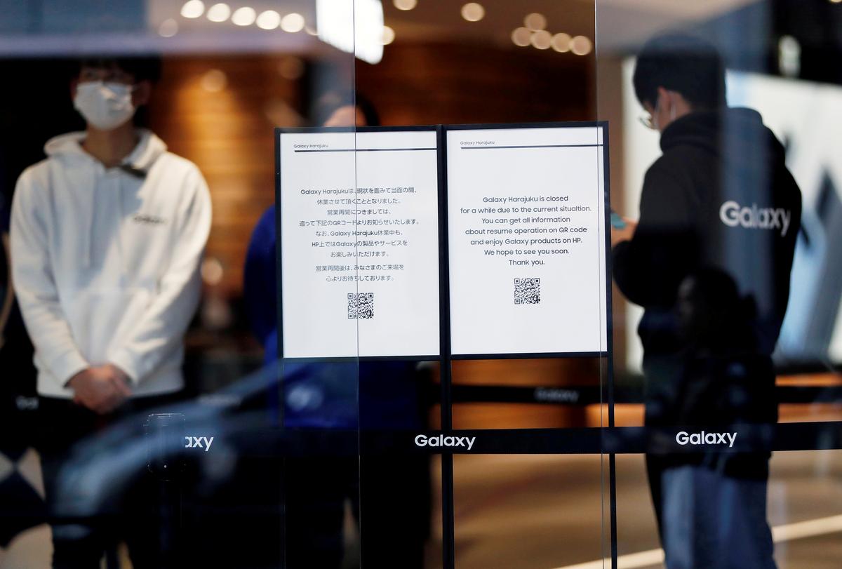 FILE PHOTO: ‘Closed’ notices are displayed at the entrance of Galaxy Harajuku, a flagship store of the Galaxy brand mobile computing devices by Samsung Electronics, during the coronavirus disease (COVID-19) outbreak, in Tokyo, Japan March 26, 2020. REUTERS/Issei Kato/File Photo