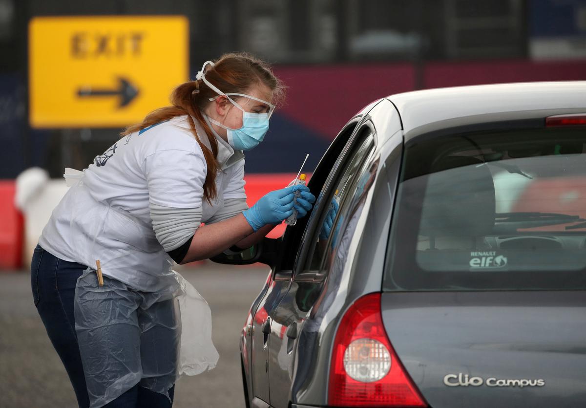 FILE PHOTO: A staff member takes a sample at a COVID-19 testing centre amid the coronavirus disease outbreak, at Glasgow Airport, in Glasgow, Scotland April 29, 2020. Andrew Milligan/Pool via REUTERS