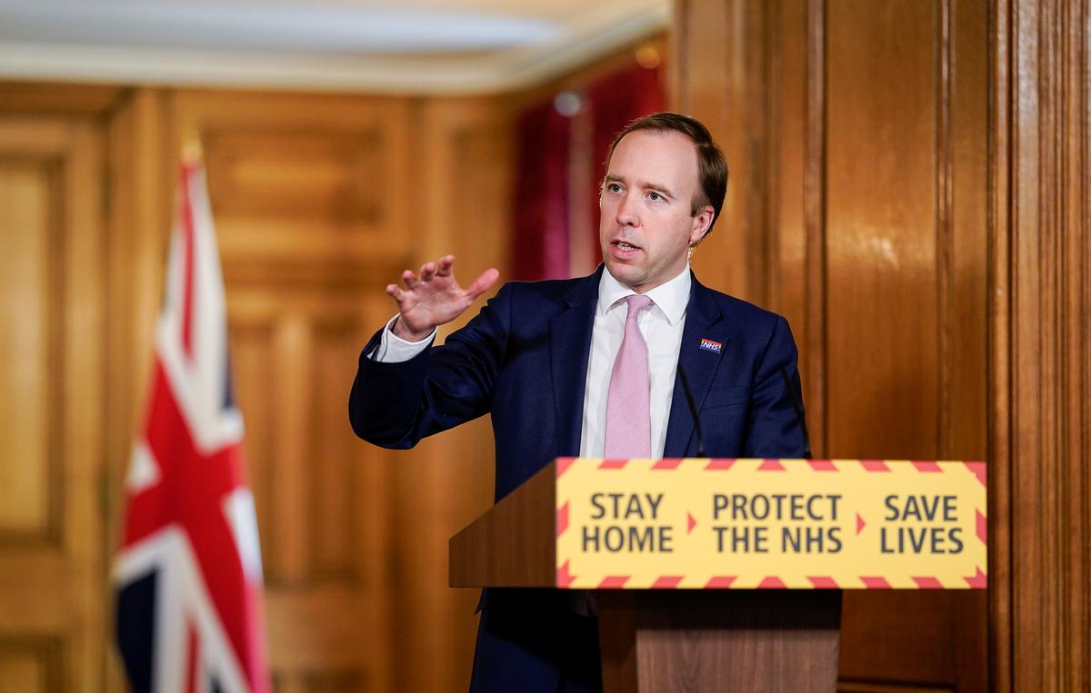 FILE PHOTO: Britain’s Health Secretary Matt Hancock chairs the Daily COVID-19 Digital News Conference with Deputy Chief Medical Officer, Professor Jonathan Van-Tam and Professor of Public Health & Epidemiology, Coordinator of the National Testing Effort, Professor John Newton to update on the coronavirus disease (COVID-19) outbreak, at 10 Downing Street in London, Britain May 4, 2020. Andrew Parsons/10 Downing Street/Handout via REUTERS/File Photo