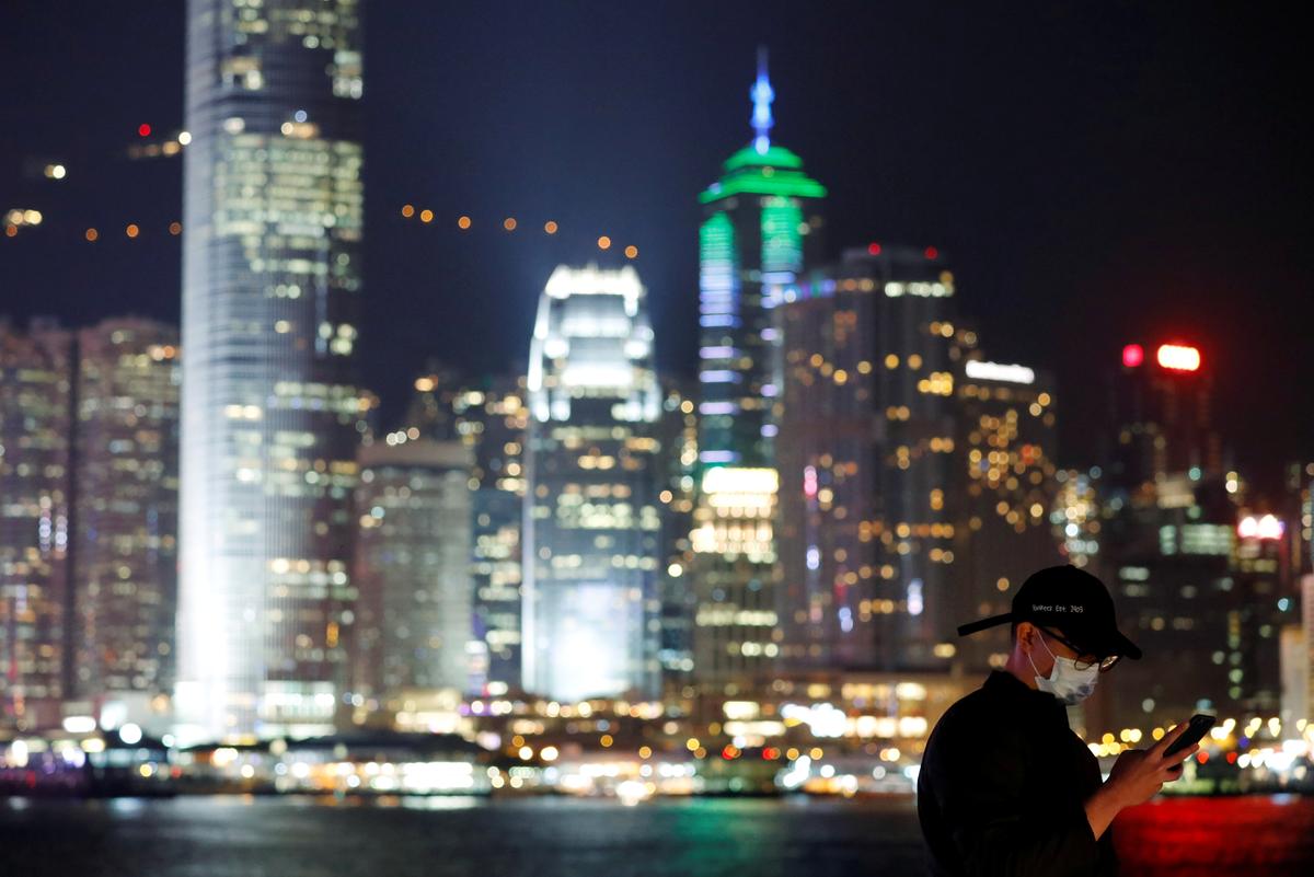 FILE PHOTO: A man wears mask to prevent a new coronavirus outbreak as he uses his mobile, with skyline in the background of Hong Kong, China, January 29, 2020. REUTERS/Tyrone Siu/File Photo