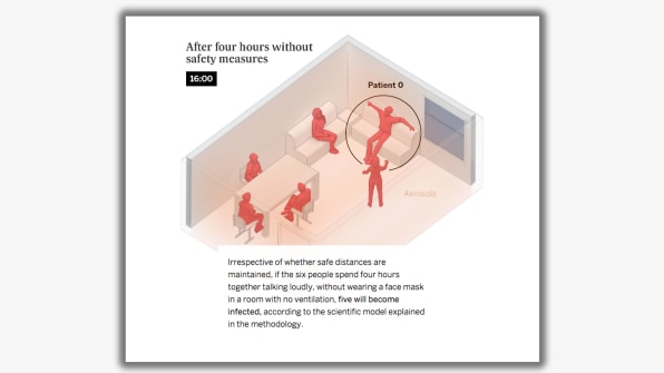 A new visualization created by graphics journalist Luis Almodóvar and published by the Spanish newspaper El País examines three common indoor situations, and shows how the virus can spread through the air if someone in the room has COVID-19. Using a model created by University of Colorado Boulder chemistry professor Jose-Luis Jimenez called the Estimator, which approximates how coronavirus-containing aerosols move around indoor spaces, the visualization provides a stunning look at how infection risk drops when certain mitigating tactics are used.