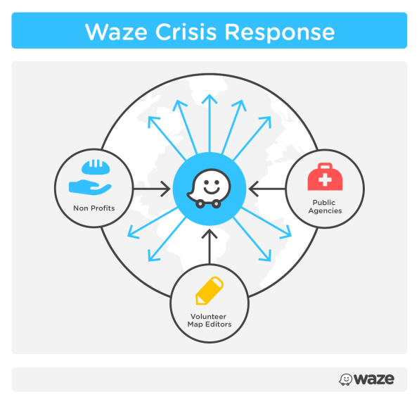 For emergency food site listings, Waze is working with Why Hunger and No Kid Hungry….